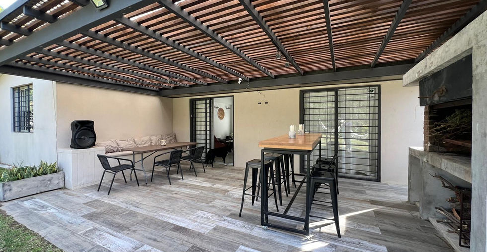 La casa principal cuenta con 64 m2, cocina y living semi integrados, dos dormitorios y baño completo. La casa tiene salida a una hermosa pérgola abierta y techada con parrillero de 22 m2 muy disfrutable con vista al fondo y con gran vegetación. La construcción es de estilo tradicional con revestimiento interior de yeso, super térmica. Toda las aberturas cuentan con rejas. En la parte posterior del terreno hay una casa de huéspedes o playroom con baño completo de 20 m2 (conexiones para kichenette) con salida a un deck en madera y a la piscina climatizada con bomba de calor (espejo de agua de 6,60x2,40 m). El baño cuenta con acceso interior y exterior para servir al área de piscina. El estilo de construcción es steel framing. En el costado de la casa tiene un cuarto de herramientas de unos 2 m2 que permite guardar artículos utilitarios del hogar. Por su distribución es una casa muy cómoda y confortable, que permite disfrutar de los espacios cómodamente con varios invitados. Disponibilidad para hospedar a 10 personas.